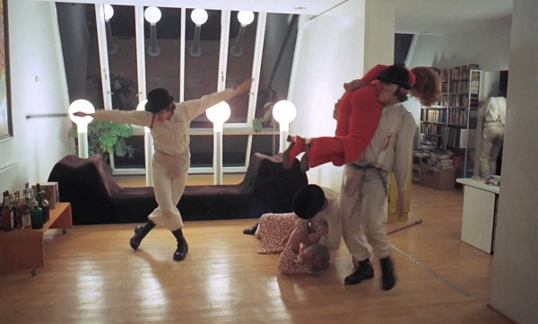 Bilinmeyen zamanda ve distopik bir mekânda geçen filmin kuşkusuz en farklı mekânı yazarın evi. Yerlerin dama tahtasını andırdığı, duvarların aynalardan ve kitaplıklardan oluştuğu, uzay aracını andıran koltukların bulunduğu ev, oldukça uçuk bir tasarıma sahiptir. İşte bu evin kitap okuyarak ya da yazarak oldukça entelektüel bir hayat sürdüren sakinleri, gece vakti zilin çalmasına anlam veremezler. Fazlasıyla bilinçli ve temkinli olan bu insanlar kapıyı açıp açmama konusunda ikilem yaşasalar da kapıdakilerin söylediklerine kayıtsız kalacak kadar insanlıktan çıkmamışlardır. Ne yazık ki kapı açılır ve çete için oyun başlar. Alex, Frank Sinatra’nın Singing in the Rain şarkısını söyleyerek çete üyeleri ile birlikte mükemmel bir düzene sahip evi yerle bir eder. Böylelikle Alex sistemin düzenine olan isyanını açık etmiş olur. Aslında çalışma masasını ve kitaplığı bürokrasiyi temsil eden objeler olarak düşünür Alex ve temsili de olsa bunları yıkmak onu fazlasıyla mutlu eder. Zira Alex’in sevdiği ve saygı duyduğu tek şey müziktir, müzik dışındaki -özellikle Bethoveen- hiçbir şeye değer vermez.   Peki bu kadarı ile yetinir mi çete üyeleri? Tabii ki hayır…  Alex şarkıyı söylerken dans etmekten de geri durmayarak yazarın karısına yönelir. Genç ve güzel olan kadına kocasının gözü önünde önce taciz, sonrasında ise tecavüz eder. Böylece toplumun cinsiyet konusundaki ahlakçı yapısından da intikamını alır. Zira Alex ve çetesi için iktidar tarafından konulan yasaların da toplum tarafından benimsenen ahlak kurallarının da hiçbir önemi yoktur.  Asıl olan tek şey isyan ve karmaşadır.