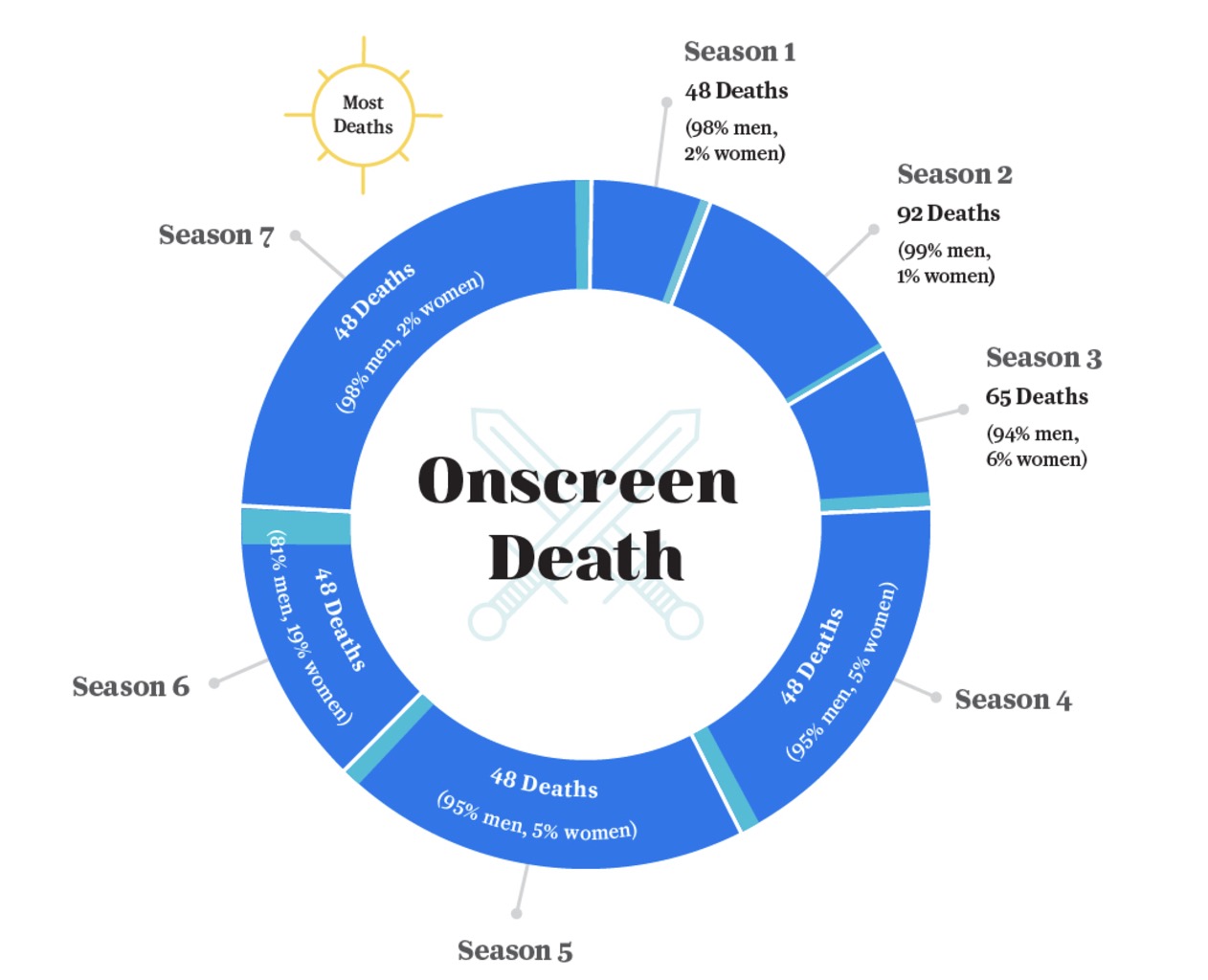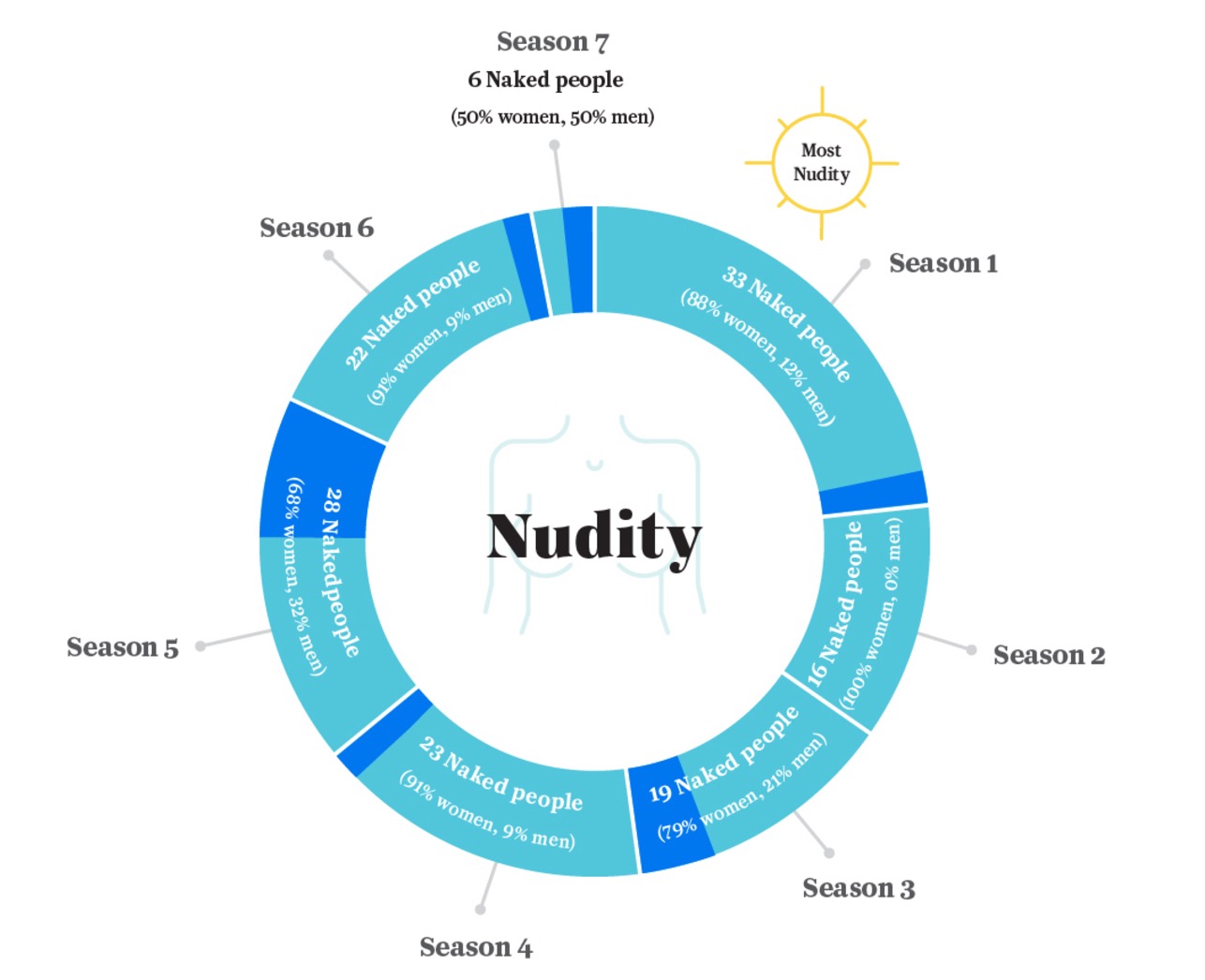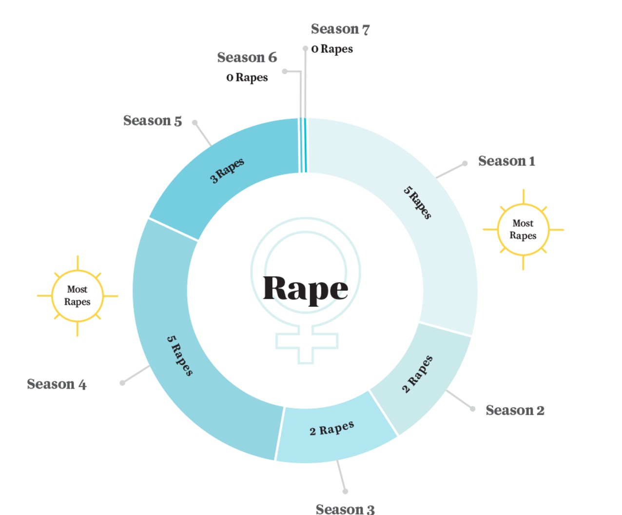 Broadly yazarı Sara David, 67 bölümlük diziyi baştan üç kere izledi ve tüm bu sahnelerin tam olarak ne kadar olduğunu saydı. Yaklaşık 200 saat süren bu araştırma sonucunda ekranlara yansıyan her tecavüz, cinayet ve çıplaklığı not alarak grafikler haline getirdi.