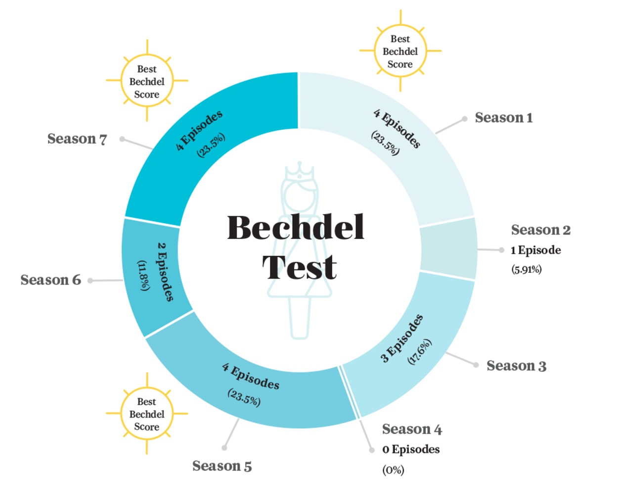 Ayrıca kadınlara verilen imajdan dolayı sürekli eleştirilen diziyi inceleyerek David, 67 bölümden kaçının Bechdel testinden geçtiğini de hesapladı. Sadece 18 gibi çok az sayıda bölümün geçmesi dikkat çekiyor.