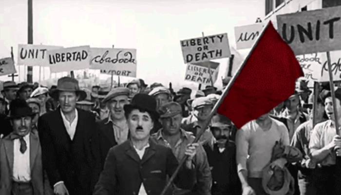 Şarlo, çalıştığı fabrikada geçirdiği sinir krizi sonrası hastaneye kaldırılmış, tedavi görmüş ve nihayet dışarıya çıkmıştır. İşsiz bir şekilde sokaklarda dolaşır Şarlo. Şarlo’nun yanından geçen bir arabadan kızıl bayrak –film siyah-beyaz olduğu için ne yazık ki bayrağı gri renkte görürüz- yere düşer. İşte ne olursa ondan sonra olur. Değme politik filmlere taş çıkaracak bir sahnedir bu. Chaplin, çok büyük olan bu derde (işsizlik, haksızlık, düşük ücret, fazla mesai vb…) kısacık bir sahneyle ve elbette mizah dolu bir anlayışla öyle güzel yorumunu getirir ki. Belki de uzun uzun diyalogların, bitmek bilmeyen sahnelerin yapamayacağını fazlasıyla yapar büyük usta. Şarlo’nun o kızıl bayrağı sallayışında hissedilen coşkunun kelimelerle tarifi olmasa gerek. Fonda duyduğumuz 1 Mayıs marşını da es geçmeyelim. Kızıl bayrağı en anlamlı sallayan oyunculardan ve böylesine anlamlı bir filmi yöneten yönetmen Chaplin’i saygıyla anmaktan başka elden ne gelir? Öyle değil mi?