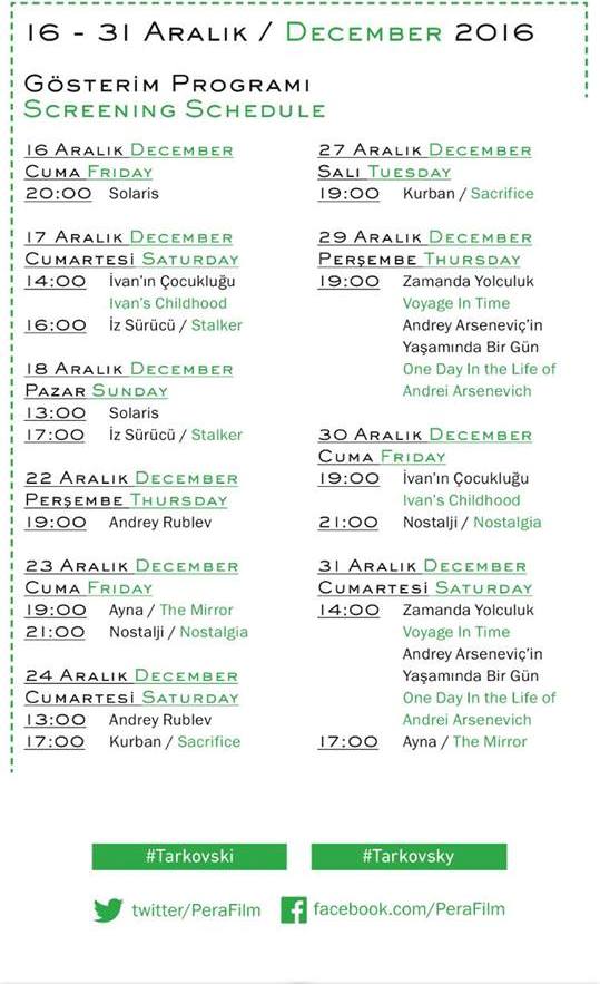 Pera Film, ölümünün 30. yıldönümünde Andrey Tarkovski’yi (1922-1986) derin, şiirsel ve son derece kişisel filmleri ile anıyor. Tarkovski ödül kazanan kısa filmi Silindir ve Keman’ın (1960) ardından ilk uzun filmi İvan’ın Çocukluğu’nu (1962) çekti. İkinci Dünya Savaşı sırasında partizanlarla birlikte casusluk yapan bir çocuğun hikayesini anlatan film, Venedik Film Festivali’nde büyük ödül kazanmıştı. Bunun ardından Tarkovski, epik ve alegorik bir film olan Andrey Rublev’i (1966) çekti. Yapımı üç yıl süren filmde 15. yüzyılda yaşayan bir ikona ressamının yaşamı, topluma, Tanrı’ya ve sanata olan inancını yitirişi ve sonunda, filmin bitimindeki ünlü çan yapımı sahnesinde ruhunun yeniden canlanışı anlatılır. Çağdaş Sovyet sanatçısının çilesine göndermeler yaptığı için yıllarca raftan inemeyen film, 1969’da Batı’da gösterime girdi ve büyük beğeni topladı. Tarkovski’nin çoğu filmi gibi burada da ağır ilerleyen, zengin dokulu bir tuval ve duygusal bir doruk noktası vardı.